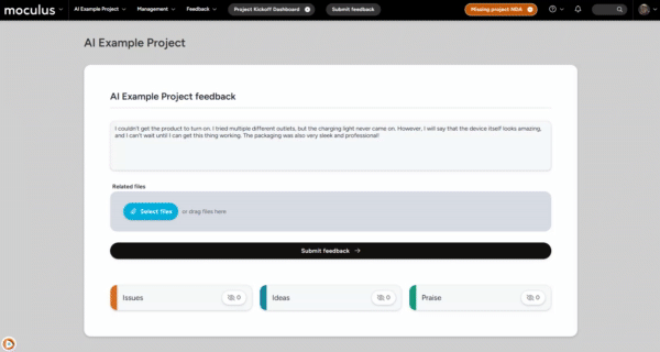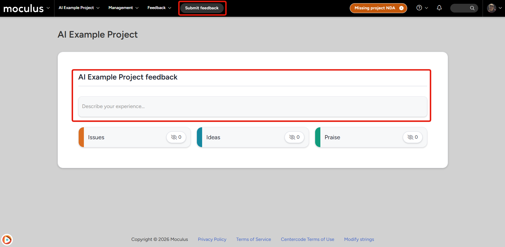 When AI Feedback Submission is enabled, the individual Submit Issue, Submit Idea, and Submit Praise buttons in the project navigation bar are replaced by a single Submit Feedback button. One button, one text box, and the AI does the sorting.