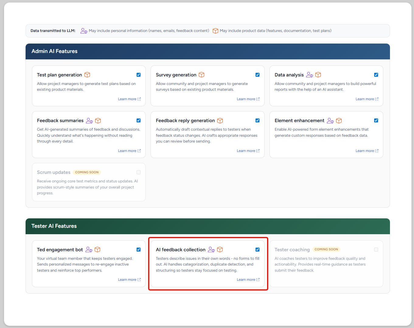 AI Feedback Submission requires configuration at two levels before it appears for testers.