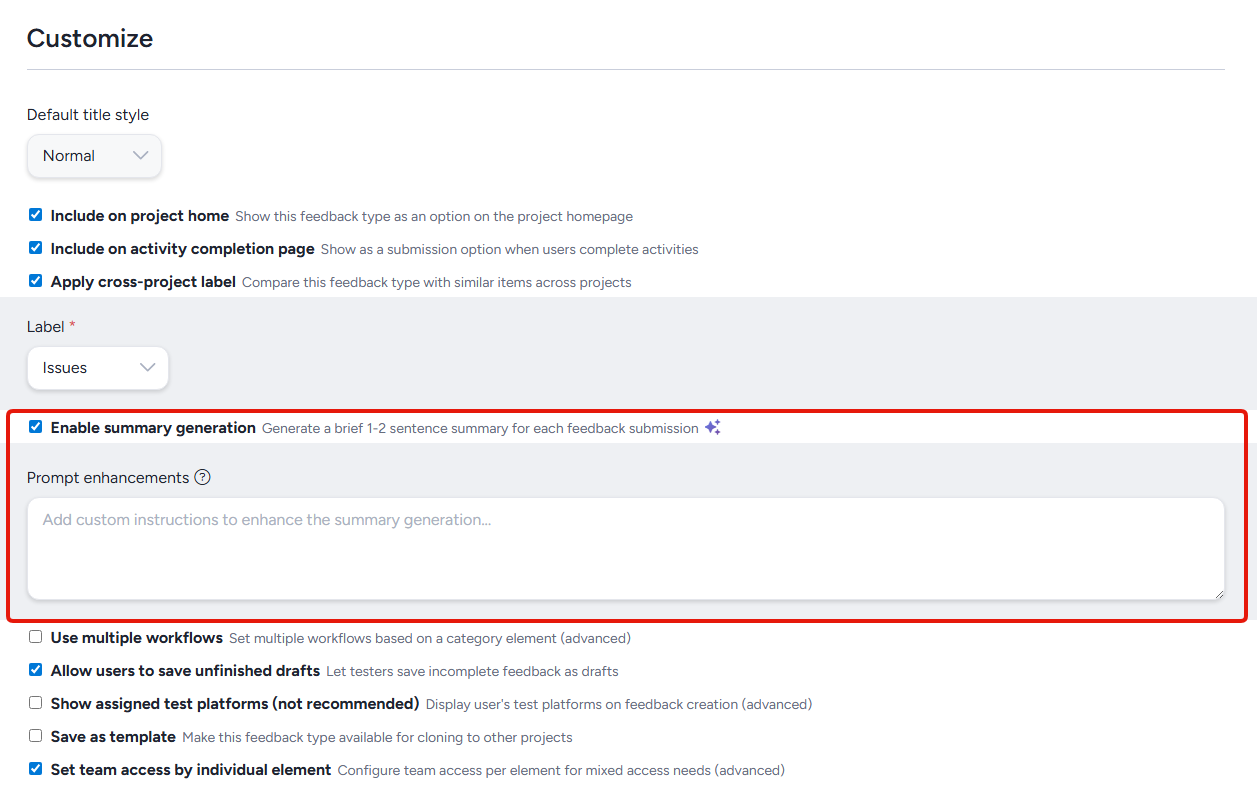 Admins can add custom instructions per feedback type to supplement the base summary prompt. This allows you to tailor AI output to the specific context of each feedback type - for example, directing the AI to focus on reproduction steps for a bug report type, or emphasize sentiment for an ideas type.