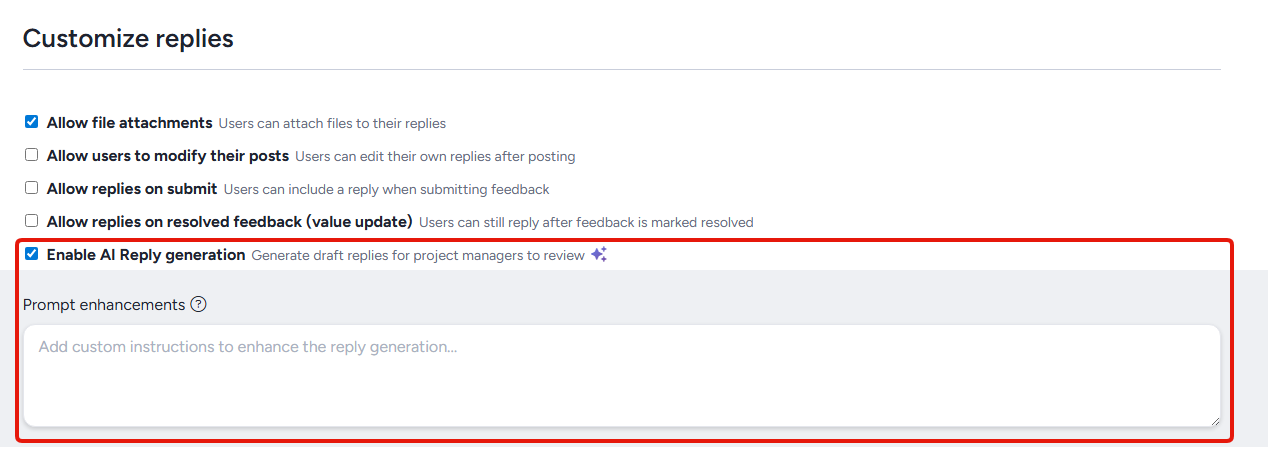 Admins can configure per-feedback-type "Prompt Enhancements" to customize the tone and content of AI-generated replies. This is useful for teams that want replies to follow a specific voice. For example, a more formal tone for enterprise testers or a more casual tone for consumer programs.