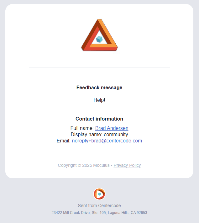When a user submits a "Contact Us" form, the information will be sent to this address with the subject line "Web feedback". To respond to the user you can either click on their email address to respond directly from your email client, or click their Full Name to be taken to their user summary, where they can be emailed from within Centercode.