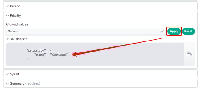 - Expanding the available Fields, select the appropriate Allowed Values and click Apply to insert the value in the JSON snippet. If no Allowed Values are appropriate or you want the snippet to include dynamic information from the Centercode Issue, leave the “PLACEHOLDER” value within the snippet.
