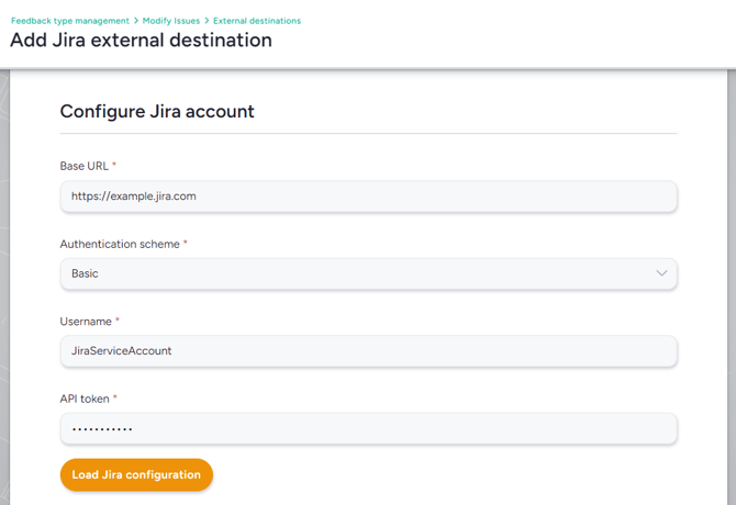 - Click Load Jira configuration to verify the Jira account and load available fields