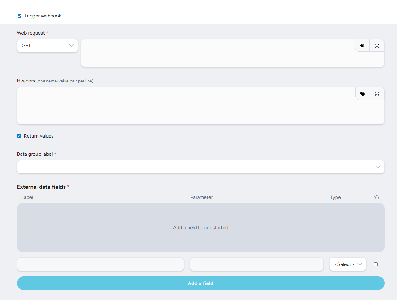 External Data Fields: (required when Return Values is enabled) Maps fields from the webhook response to fields in Centercode. Add a row for each value you want to capture, then specify the label, parameter name, and data type for each one. Click Add a field to add rows to the table.