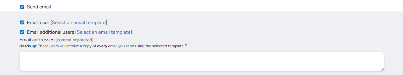 Email Additional Users: Sends email to a separate set of users using the selected template.