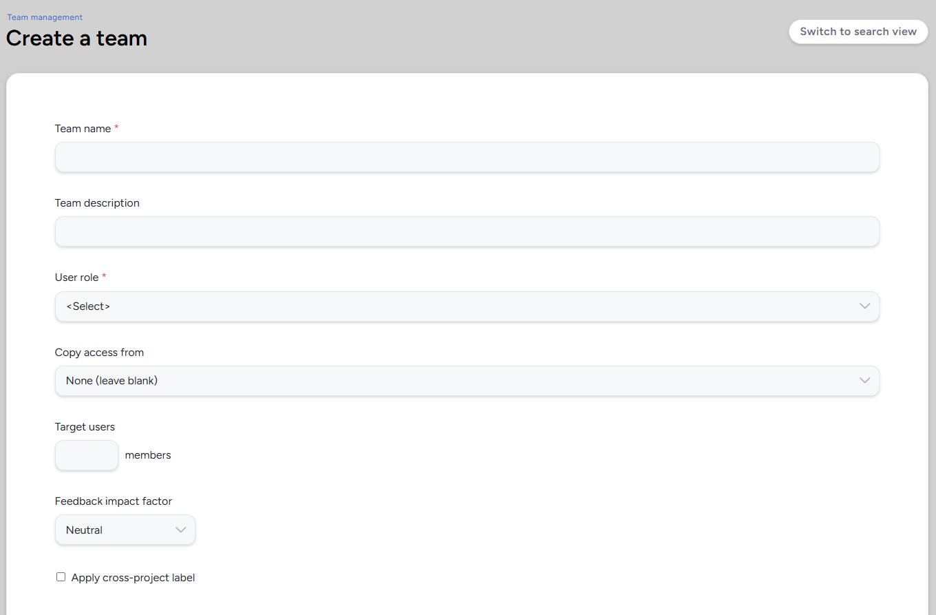 Copy Access From: Copies the access settings from an existing team in the current scope, including its user role, resource access, and feedback access. Select a team from the dropdown to pre-populate this team's access configuration. Leave blank to configure access manually.