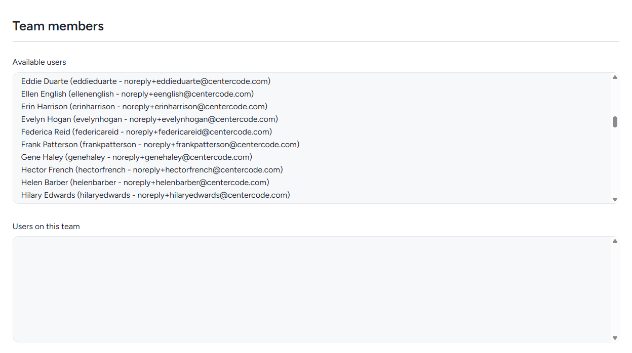 Double-click a user in the left column to move them to the right column and add them to the team. Double-click a user in the right column to remove them.