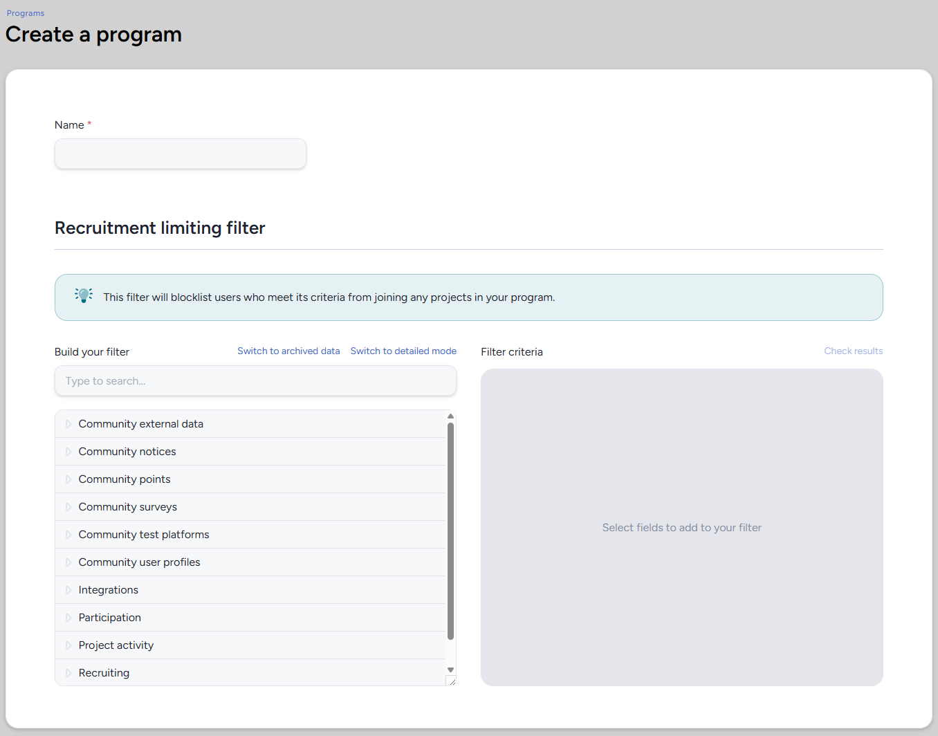 The recruitment limiting filter blocklists users who meet its criteria from joining any project within this program. This filter is optional - leave it empty if you don't need to restrict access at the program level.