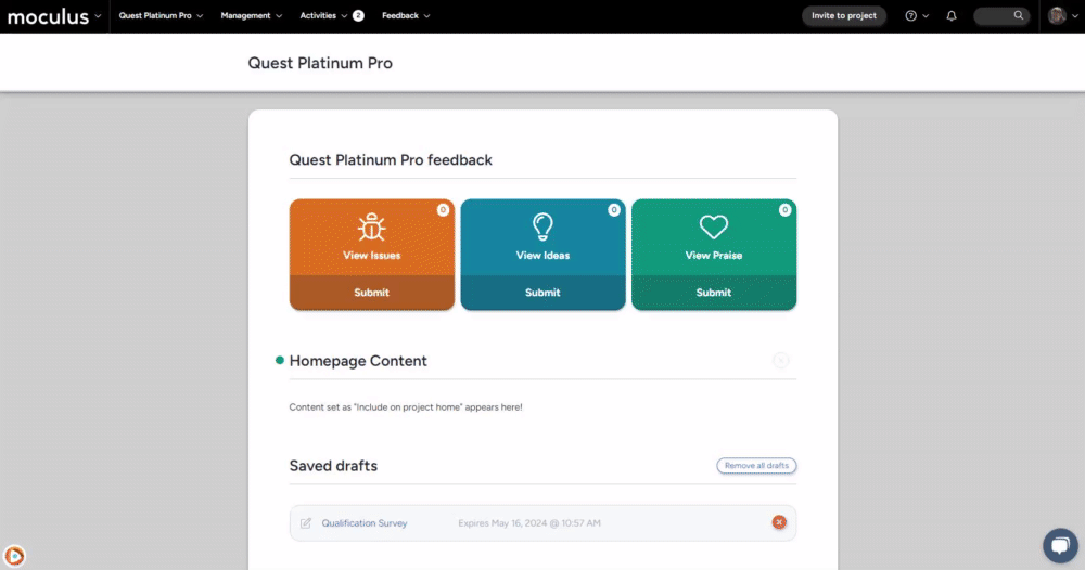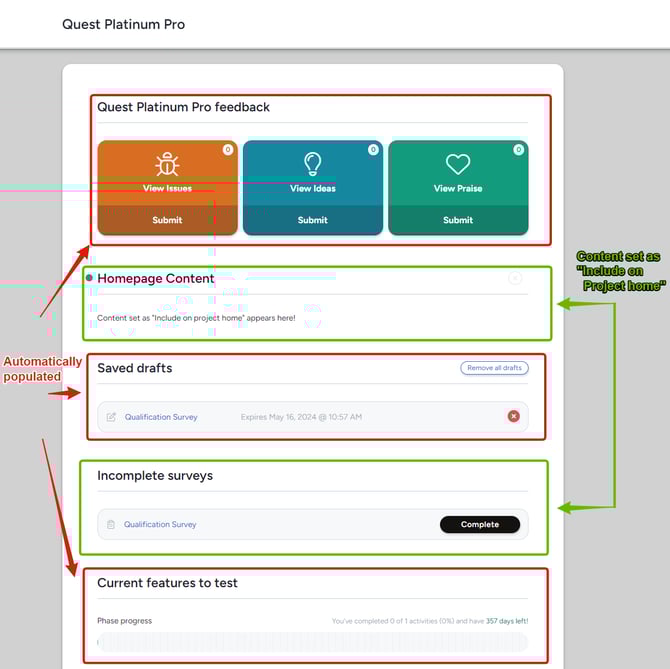 The Project Home for any given user is a combination of automatically populated elements and content specifically set as homepage content. The automatically populated content includes items such as Feedback buttons, a list of the current phases features and their completion status, and any pending survey or feedback drafts. Users can also see any content set as “Include on Project Home”.