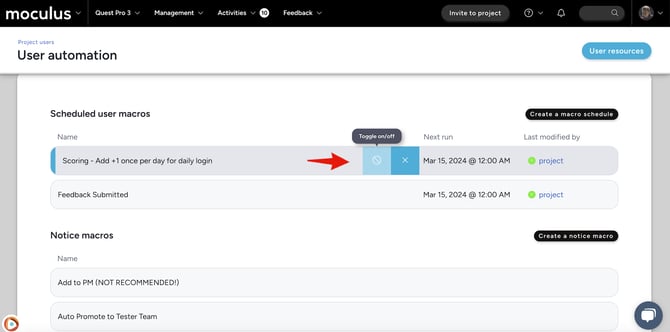 A macro in Centercode is a singular object that performs a sequence of predetermined outputs or actions. Macros can be used to automate repetitive tasks and save time by performing those tasks at a click, on a schedule, or on certain events. In this example, you're creating a Macro to apply a Project or Community score to your users. Note that Macros don't run by themselves. They need something to tell them when to run, like a schedule, trigger, Notice, or other event. Repeat sections 1 and 2 below until you've completed your Project's scoring system.
