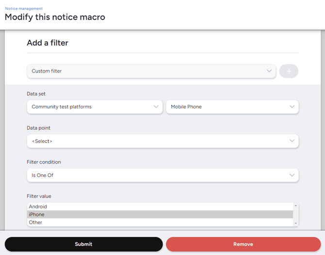 The Conditional Macro Type allows you to set filter criteria for targeted users in order for this Notice Macro to execute on. For example, a notice macro could be set up so any user that has answered they own an iOS device on their profiling forms will be put on the iOS Team.