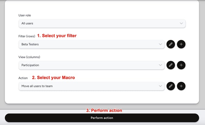 Note: Please refer to the Macros FAQ if you're unfamiliar with creating Macros. When creating your Macro, consider adding users to a Team and removing from the previous Team.