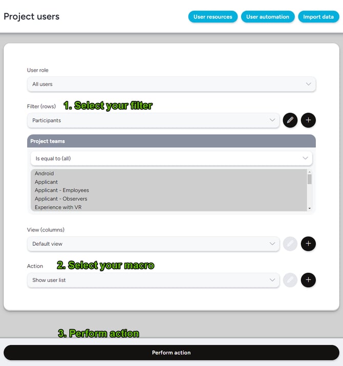 User macros give you the ability to impact individual users in your community or project in a variety of ways. Some common user macros use cases are emailing users, adding a user rank or comment, adjusting user teams, or even removing users.