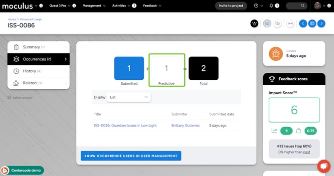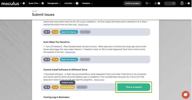 Predictive match presents testers with feedback that matches keywords in the potential submitter’s title and description. When the potential submitter enters their title and a match is displayed, they can select “This is a match" or “Create new feedback.” When selecting “This is a match”, the “parent” (existing) feedback’s feedback score is increased.