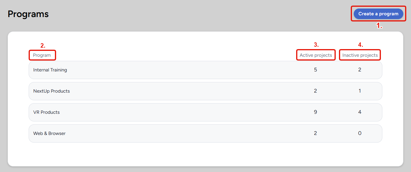 2. Program: The name of the program. Click a program row to go to the Projects Management page for that program, showing all projects within it.