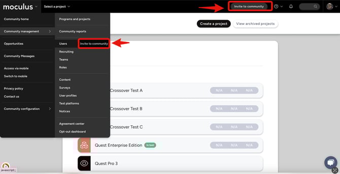 The Invite to community/Invite to project feature exists to swiftly bring users into your portal on the fly. You’re able to access it anywhere within your community and project at the top right of your navigation menu or within the users section of your community or project menu.