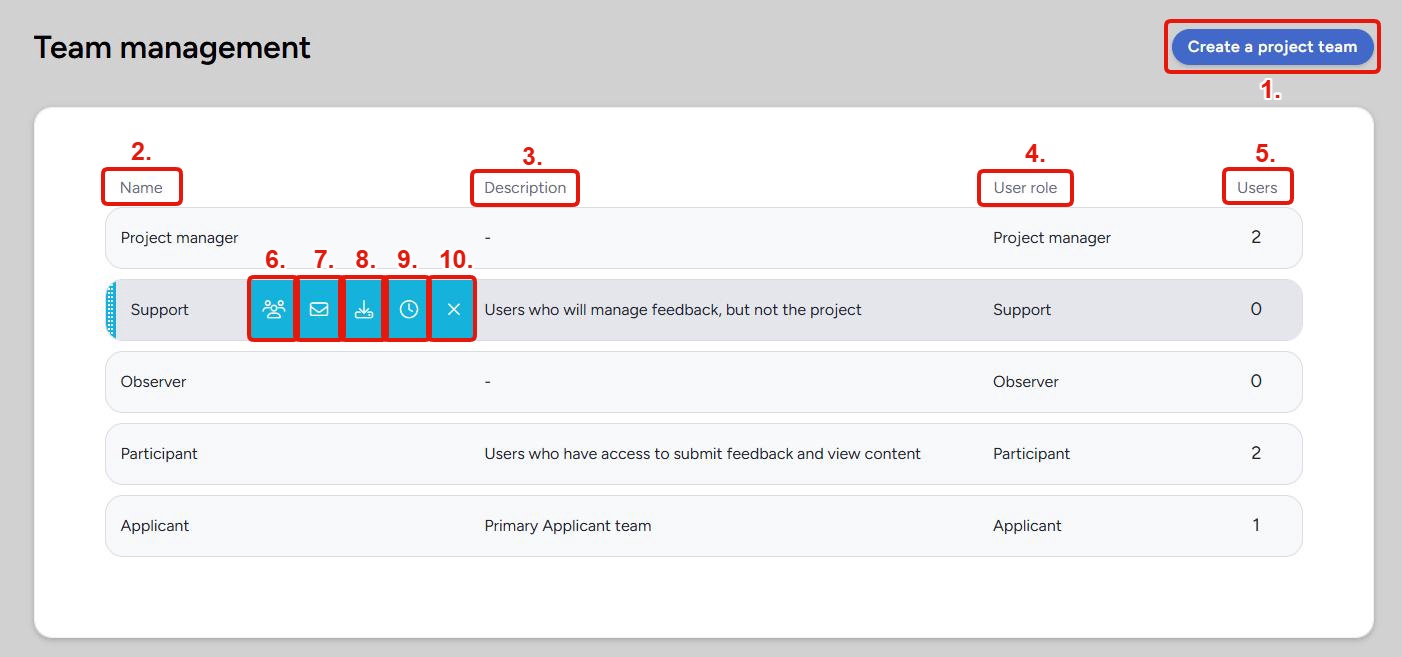 10. Remove (X icon): Removes the team entirely. This does not remove users from the community or project, but users who are on no other teams may lose access to resources. Review team membership before removing.