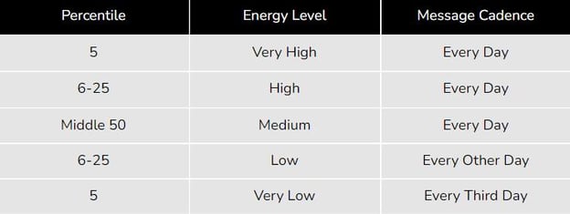 Typical: During engagement phases Ted will send out one automated email per day to your testers. To determine how frequently to contact testers, Ted is designed to individually track each tester's “Energy Level”. Testers who log on frequently are determined to have a high “Energy Level” and will be contacted more frequently to encourage and maintain high levels of engagement.