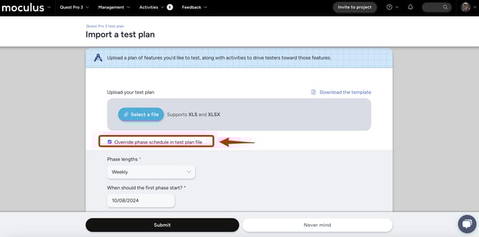 - When you select Override phase schedule in test plan file, you will be prompted to specify the phase length, which can be weekly, bi-weekly, or monthly. Additionally, you can choose the start date for the phases.